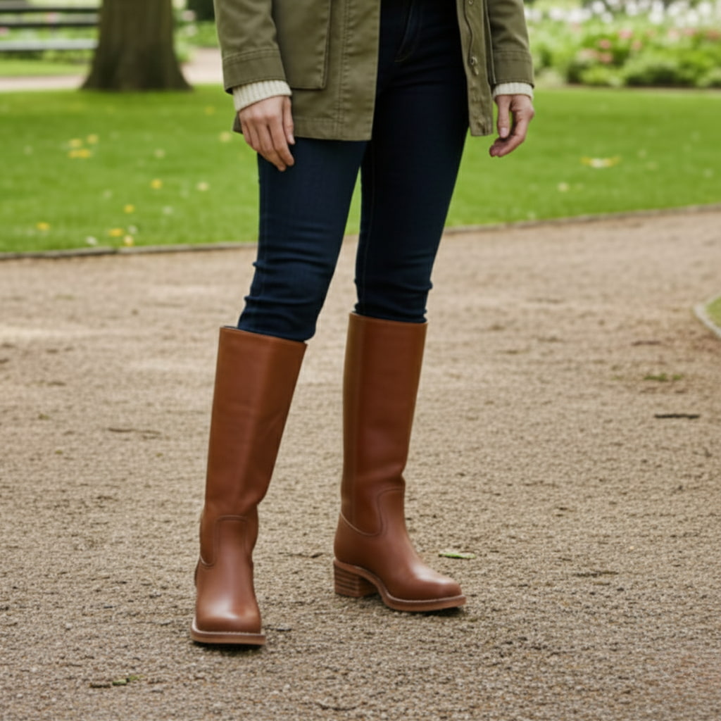 Damen Braune Kniehohe Stiefel - Blockabsatz mit Reißverschluss