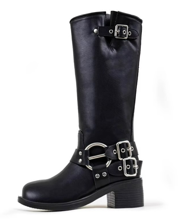 Damen Kniehohe Stiefel - Schnalle & Niedriger Blockabsatz