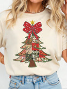 Frisk din festlige garderobe op med dette bløde og stilfulde stykke, der er designet til komfort hele dagen. Dame beige jule-T-shirten har en tiltalende neutral farve beige som base, der giver et subtilt, men smart fundament for det sjove design. Dette kortærmede top viser en unik og iøjnefaldende patchwork-juletræ-grafik, der giver det festlige tema en hyggelig, håndlavet følelse. Fremstillet af et let elastisk strik-stof, er denne top perfekt til fritidstøj og tilbyder en afslappet pasform, en behagelig rund halsudskæring og en flatterende oversize-pasform med raglanærmer og tunika-længde.