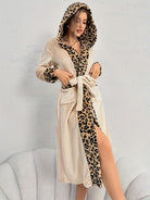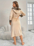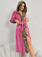 Damen Leopardenprint Morgenmantel - Kapuzenbesatz Robe mit Taschen