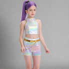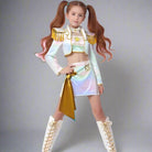 Conquer the spotlight instantly by choosing the Kpop Idol Halloween Costume. This bold holographic set is the definitive ensemble for any young star wanting to channel their favorite idol style for a dance performance or a spooky celebration. With a shimmering crop top and matching mini skirt, the lightweight and flexible composition ensures comfort for energetic routines. The material catches the light with every movement, providing a truly stage-ready shine. This vibrant outfit is perfect for Halloween, conventions, or any event where capturing the audience's attention is key.