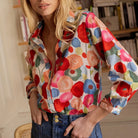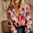 This blouse is available in a floral print. Sizes range from S to 2XL. If you are unsure between two sizes, we recommend choosing the larger one for a better fit.