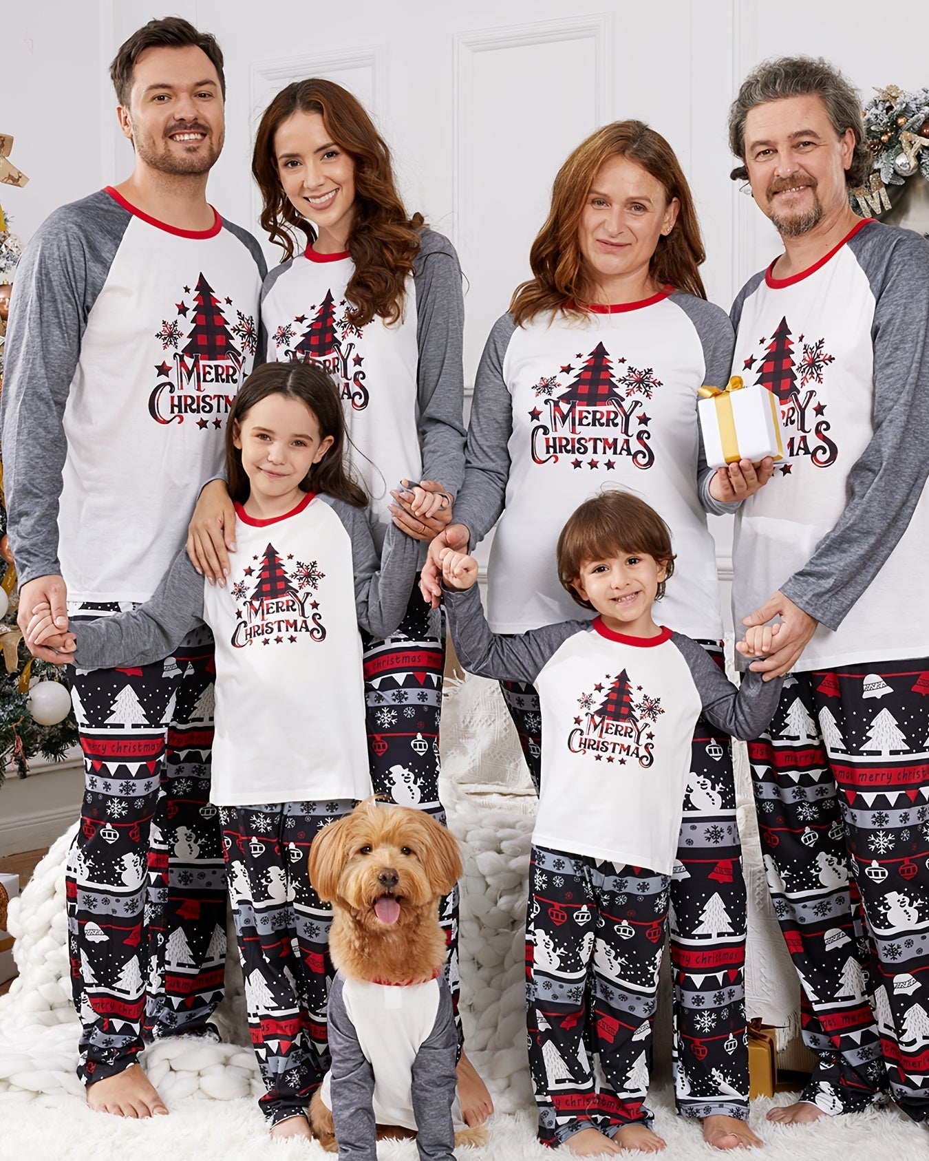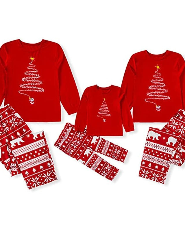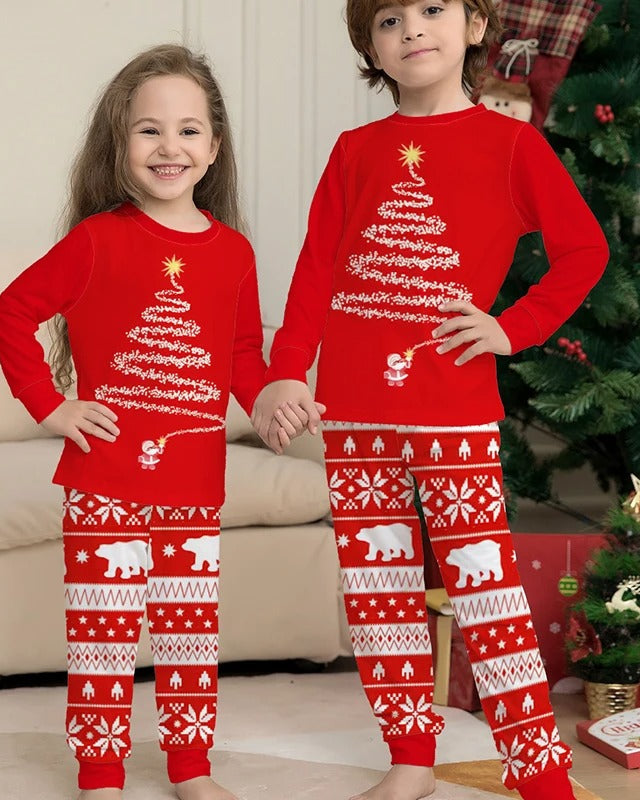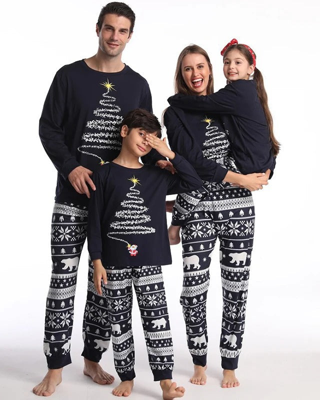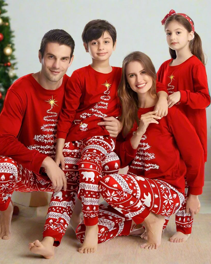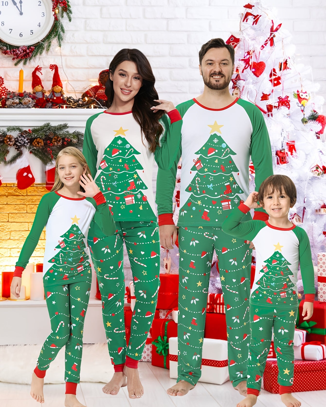 Pijama familiar navideño verde unisex - Motivo de árbol de Navidad y pantalones con patrón festivo