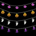 Zestaw łańcuchów świetlnych prezentuje urocze motywy dyni, duchów i pająków, z których każdy jest podświetlony w świątecznej kolorystyce pomarańczowej, białej i fioletowej. Ten dekoracyjny dodatek jest dostępny w standardowej całkowitej długości 1,65 m (5,3 stopy), co czyni go idealnym do zawieszenia nad gzymsami kominkowymi, oknami lub balustradami.