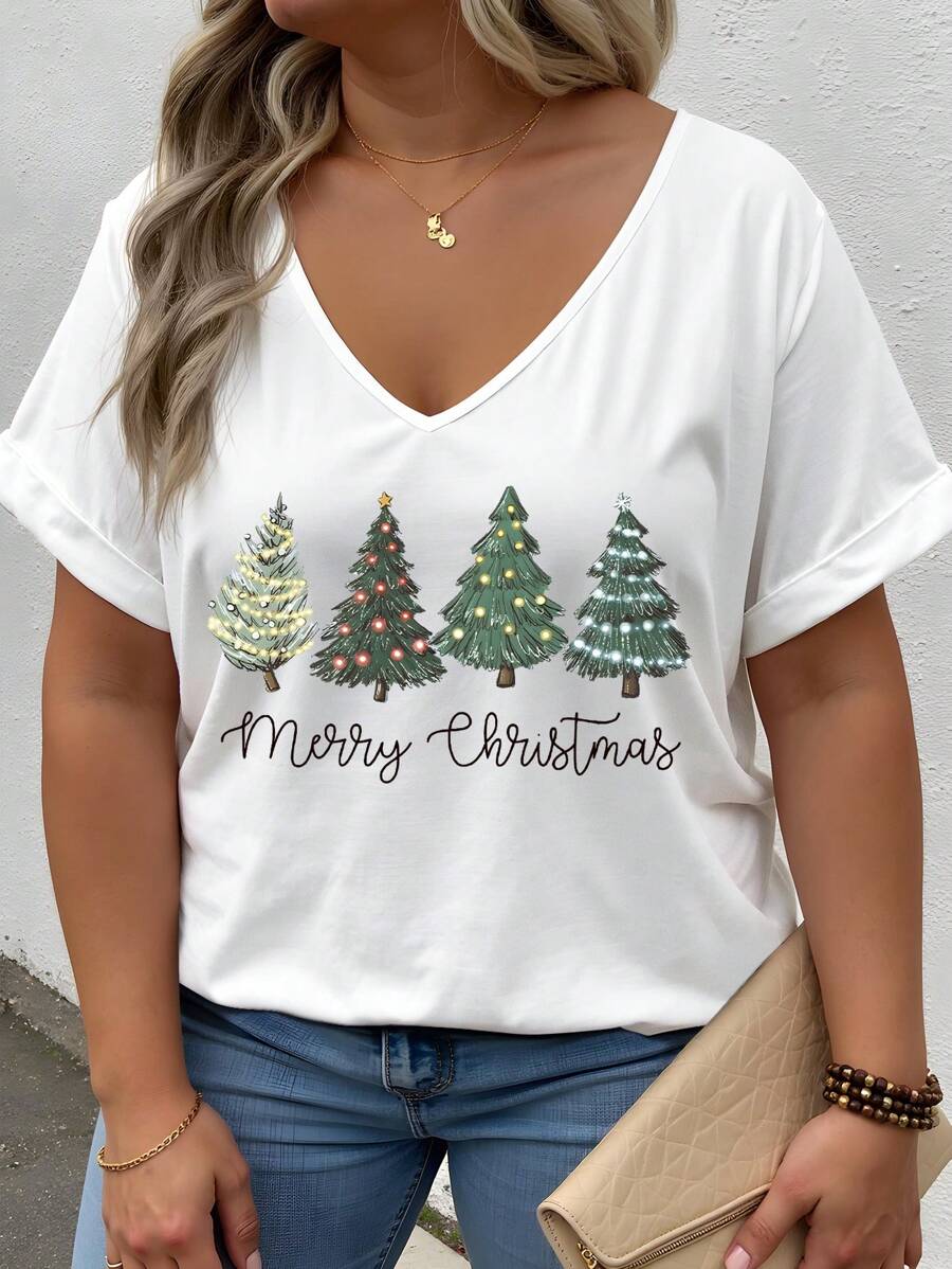 Damen Weißes Weihnachts-T-Shirt - V-Ausschnitt mit Weihnachtsbaum-Print